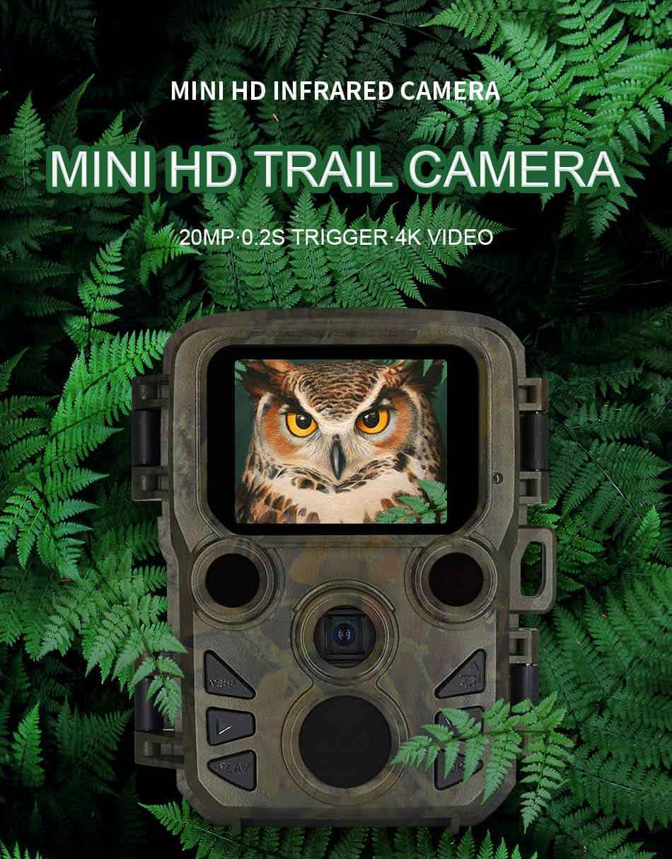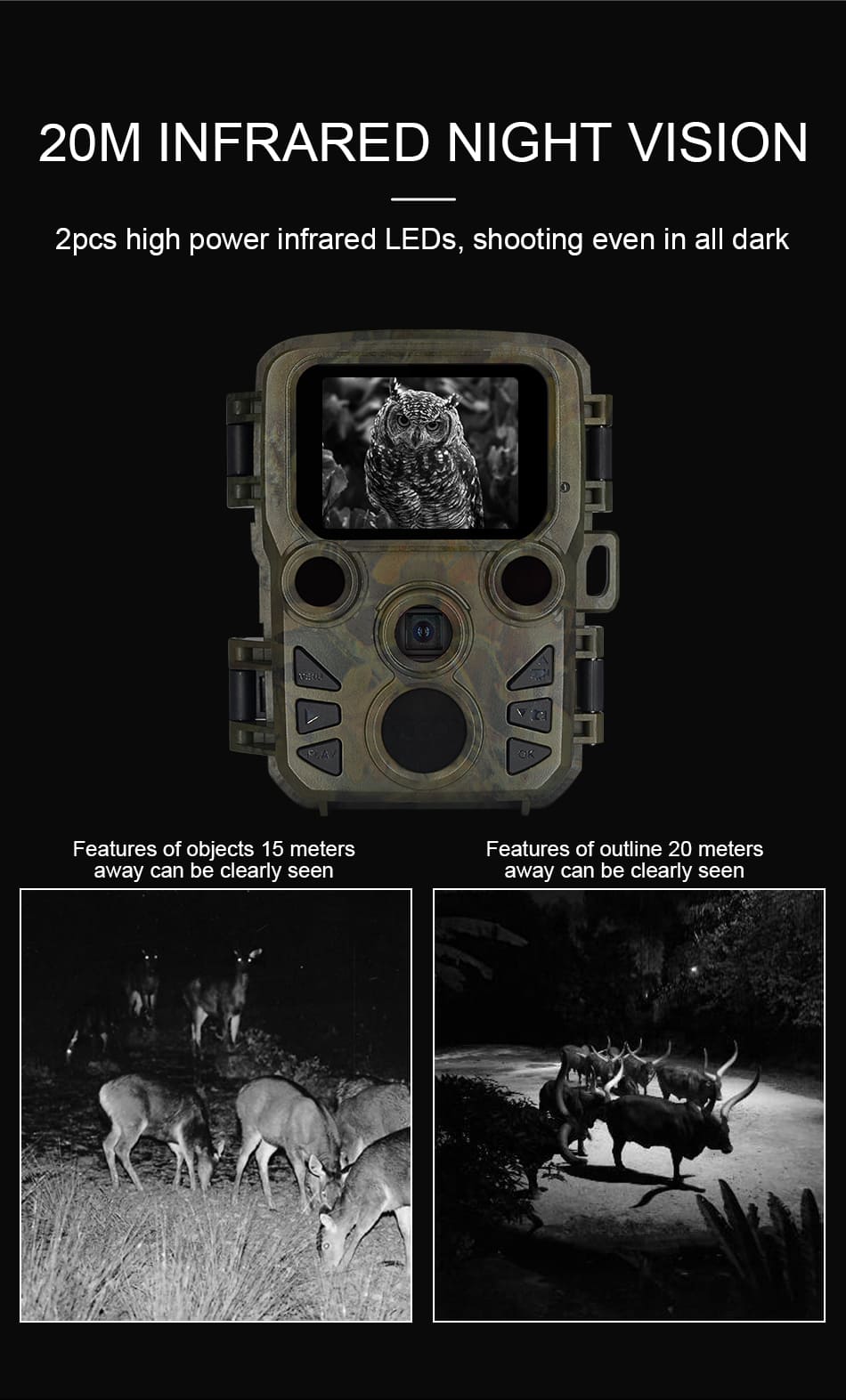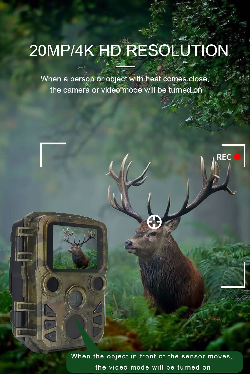 Ultra-mini trail camera, HD sensor support for 20 megapixel photos, 4k video. 2.0 inch TFT LCD display, support playback. With 2 high-power infrared LEDs, make photos and videos clear at night. This hunting trail camera has 1 PIR sensor, 60 degree PIR sensing wide angle, 20 meters sensing distance, only 0.45 seconds trigger time. 16 months standby time, IP66 waterproof, also suitable  outdoor use