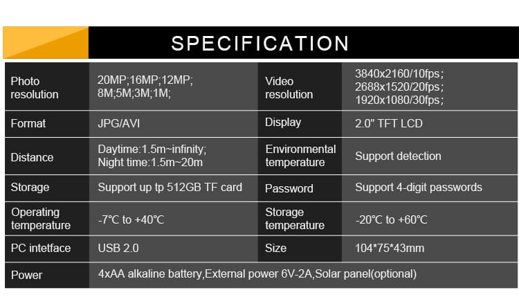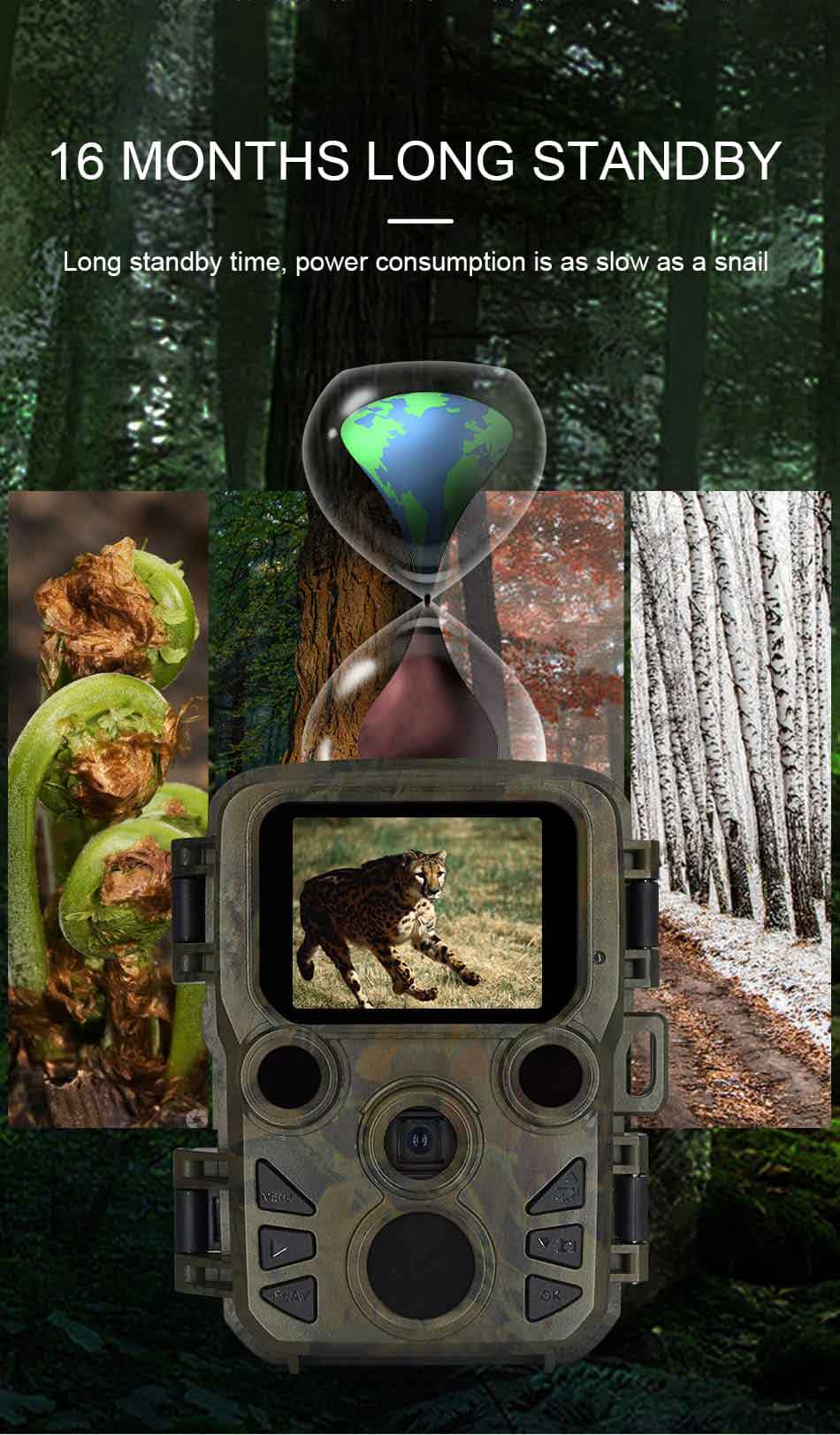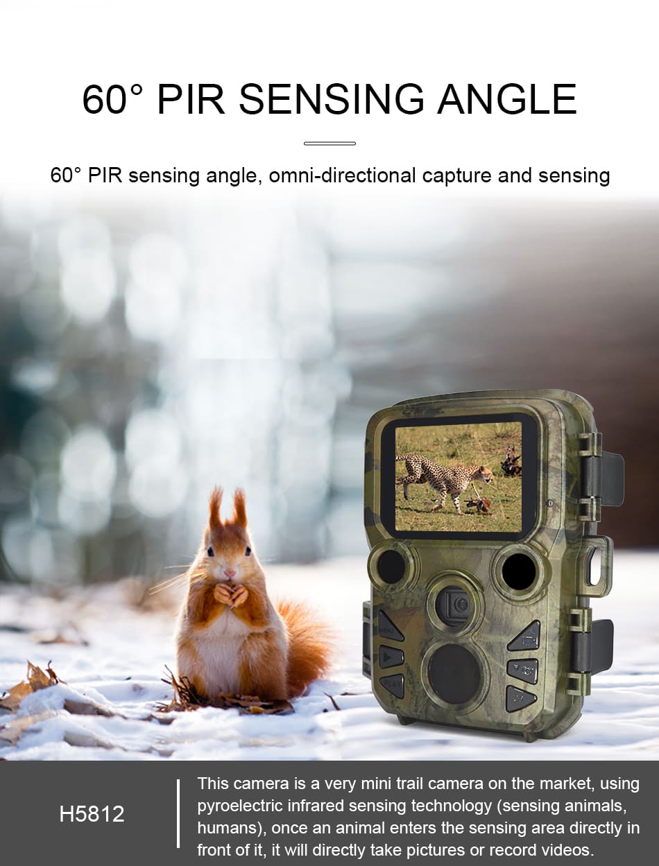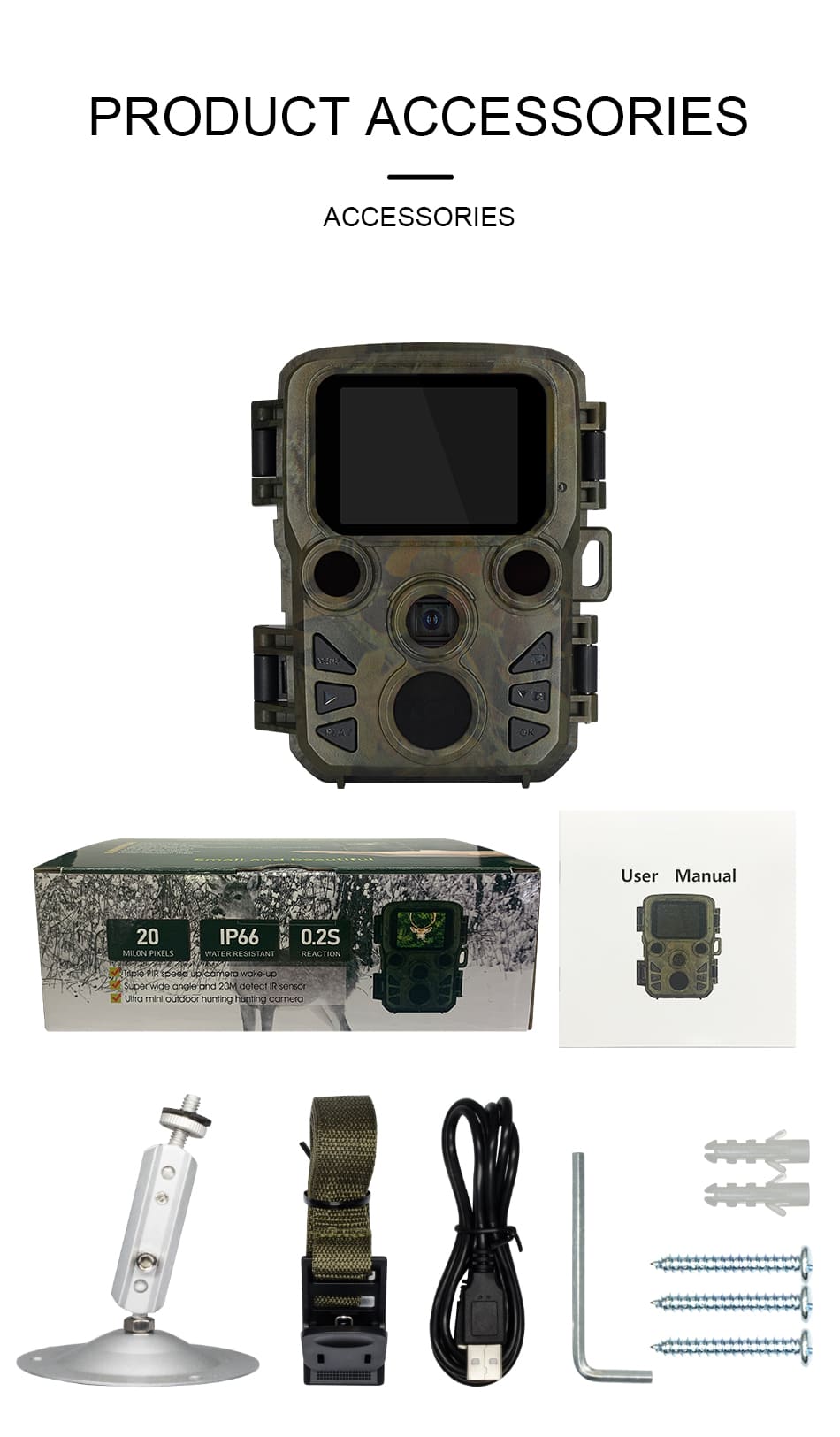 Ultra-mini trail camera, HD sensor support for 20 megapixel photos, 4k video. 2.0 inch TFT LCD display, support playback. With 2 high-power infrared LEDs, make photos and videos clear at night. This hunting trail camera has 1 PIR sensor, 60 degree PIR sensing wide angle, 20 meters sensing distance, only 0.45 seconds trigger time. 16 months standby time, IP66 waterproof, also suitable  outdoor use